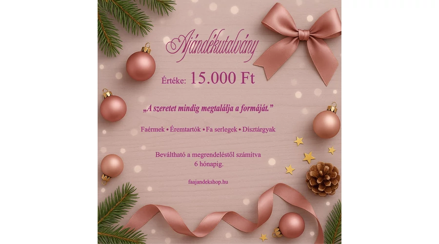 Ha idén karácsonykor igazán biztosra mennél, az ajándékutalvány tökéletes választás. Ünnepi hangulatú, mégis praktikus meglepetés, amelynek mindenki örül — hiszen a megajándékozott maga választhatja ki, melyik fa ajándék, dekoráció vagy különleges díjtárgy tetszik neki a legjobban. A Faajándékshop teljes kínálata felhasználható: fa érmek, éremtartók, fa serlegek, díjak, ünnepi díszek, egyedi ajándéktárgyak és személyre szabott megrendelések is.